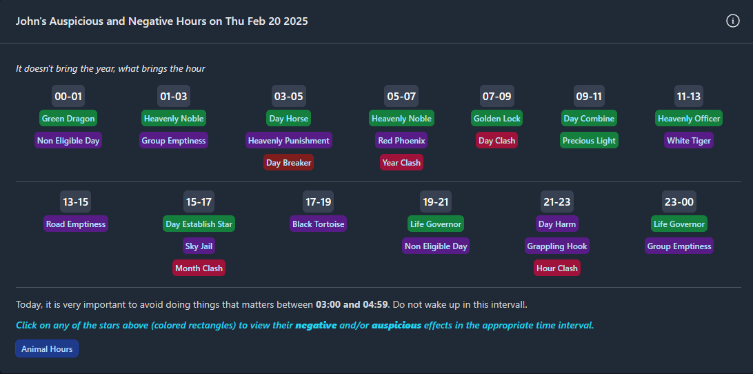 Energia acestor ore nu este generală, ci interacționează cu harta Ba Zi a fiecărei persoane. Unele ore pot aduce noroc și productivitate, în timp ce altele pot provoca obstacole.